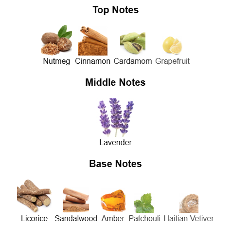 Top Notes: The fragrance opens with a bold fusion of grapefruit, cinnamon, nutmeg, and cardamom. The zesty brightness of grapefruit contrasts with the fiery warmth of cinnamon and nutmeg, while cardamom adds an aromatic depth—an exhilarating introduction that ignites the senses.
