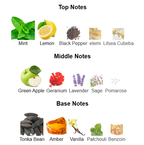 Top notes: The scent begins with a vibrant mix of Italian lemon, mandarin, and crisp green apple. The lively citrus notes of lemon and mandarin deliver an invigorating rush, complemented by the fresh sweetness of green apple. It's akin to a revitalizing breath of fresh air, instantly energizing and stimulating the senses.